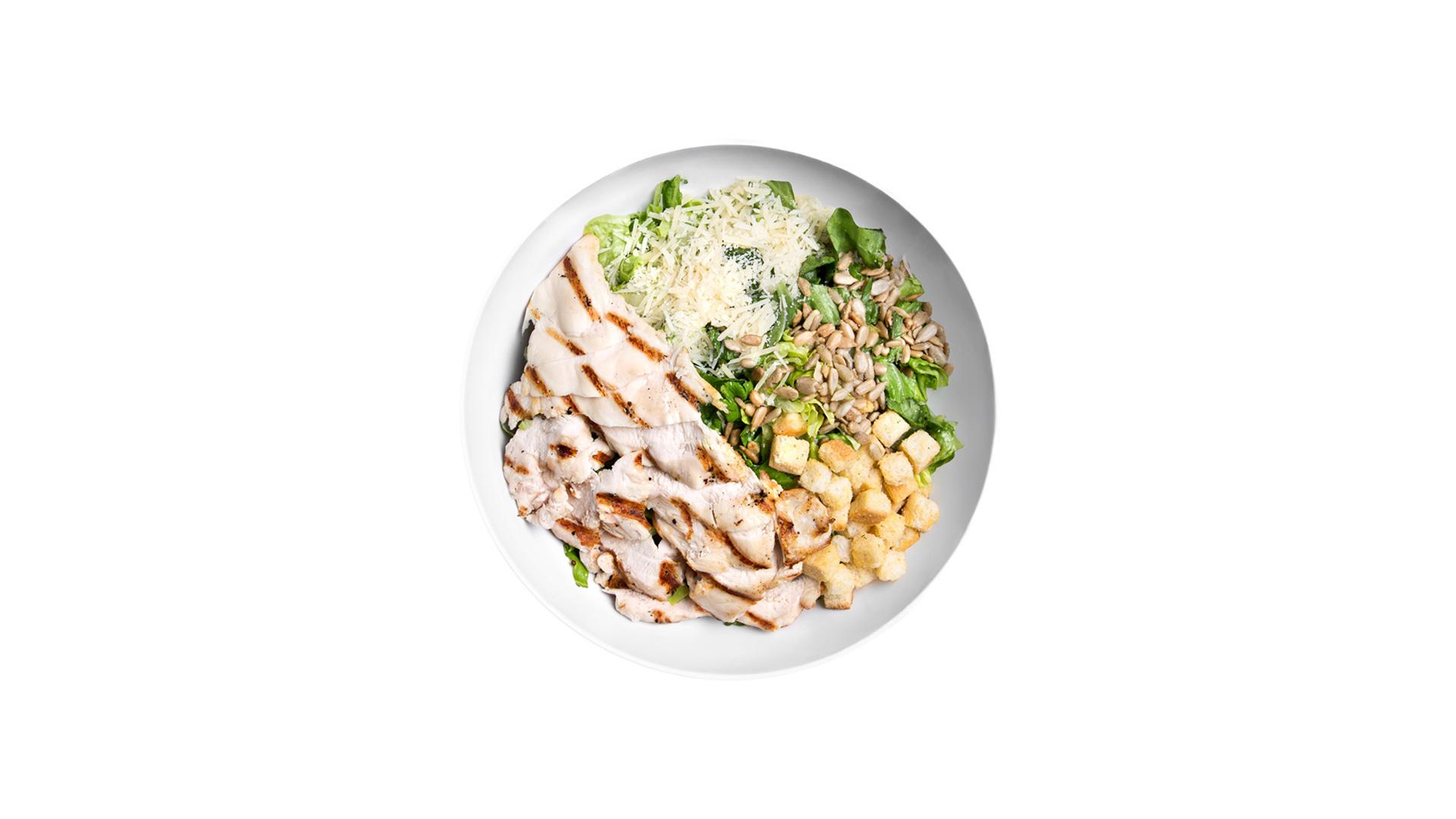 Grilled Chicken (ABF), Parmesan, Lettuce, Sunflower Seeds, Croutons, Caesar Dressing. (690 cal / 57 protein, 25 carbs, 42 fat)