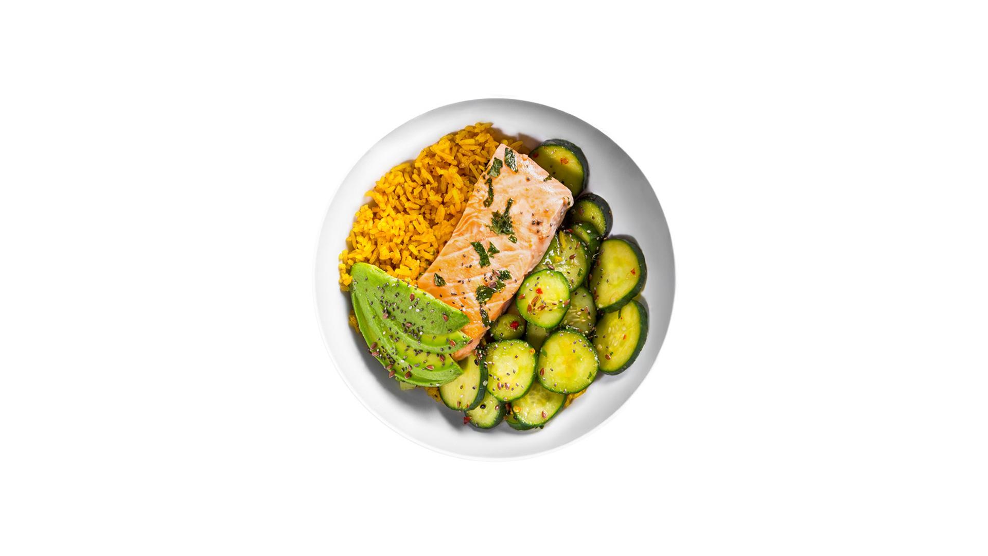 Sustainably and Responsibly Sourced Salmon*, Turmeric Rice, Cucumber Salad, Avocado, Flax Seeds, Chia Seeds, Chimichurri Sauce. (557 cal / 37 protein, 63 carbs 18 fat) [Gluten-Free]