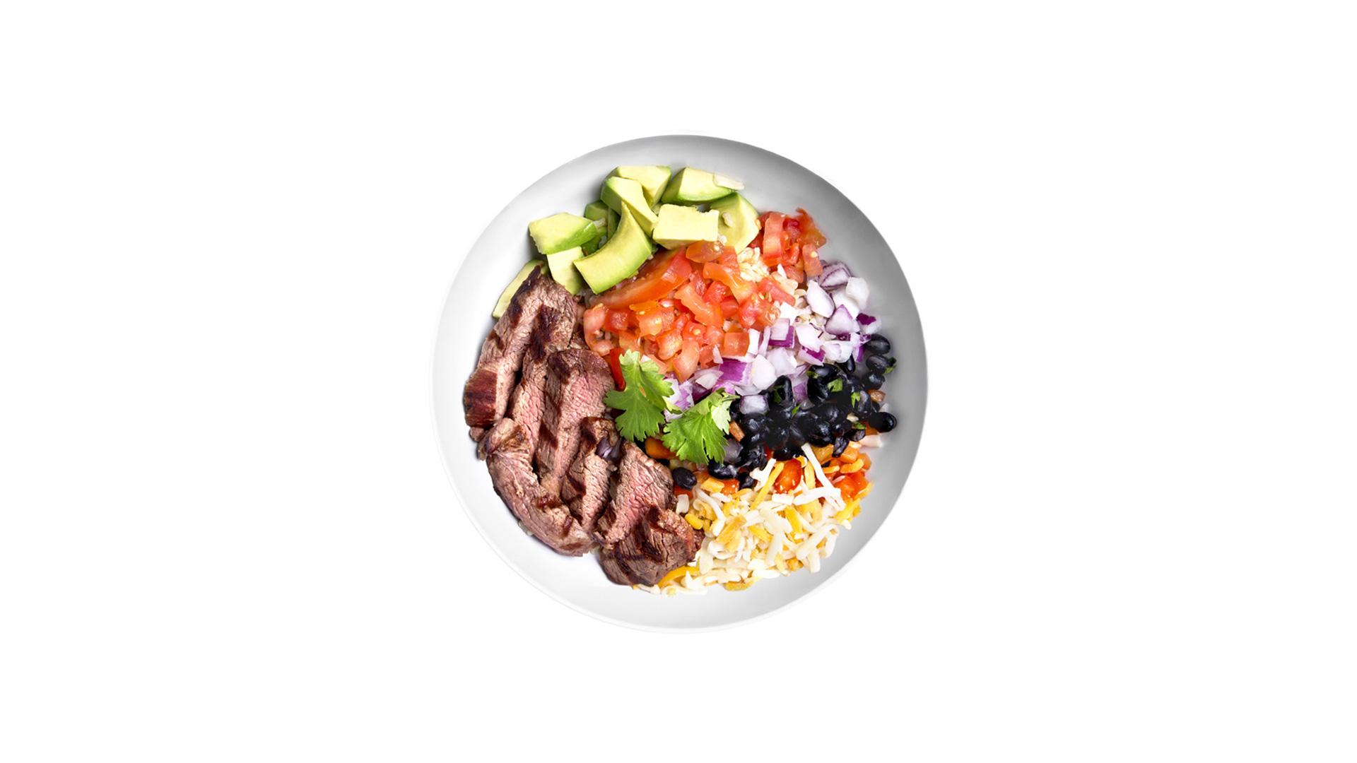 100% Angus Beef Steak*, Cheddar, Avocado, Black Bean Salsa (Black Beans, Tomatoes, Cilantro, Red Peppers, Onions). (726 cal / 51 protein, 66 carbs, 27 fat) [Gluten-Free]
