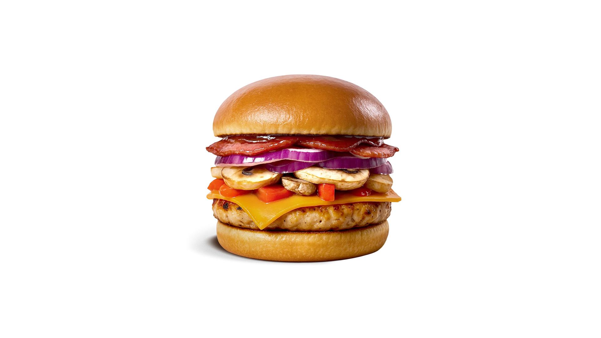 Turkey Patty (ABF), Turkey Bacon, Cheddar, Mushrooms, Red Peppers, Red Onions, Housemade BBQ Sauce. Served with Side of Fruit. (662 cal / 52 protein, 55 carbs, 26 fat)