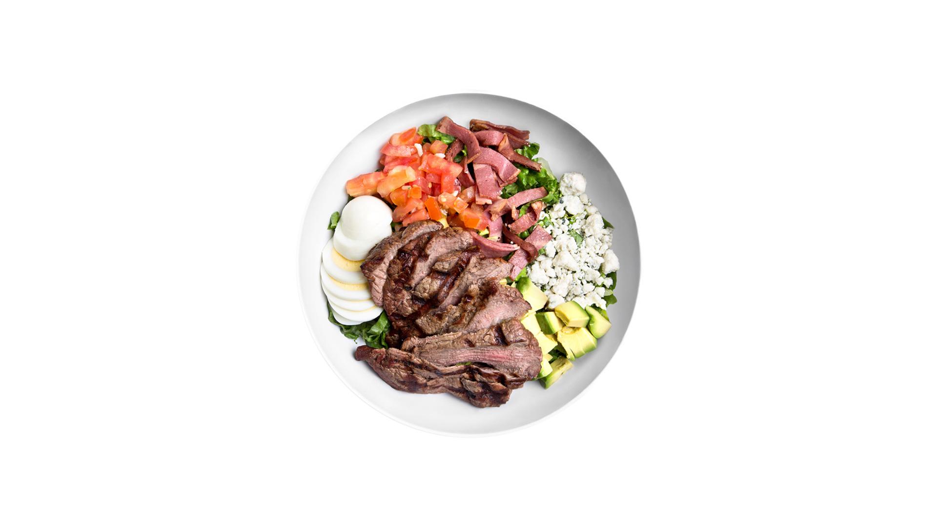 100% Angus Beef Steak*, Turkey Bacon Bits, Organic Hard Boiled Egg, Blue Cheese, Avocado, Tomatoes, Lettuce, Housemade Balsamic Vinaigrette. (626 cal / 51 protein, 15 carbs, 41 fat)