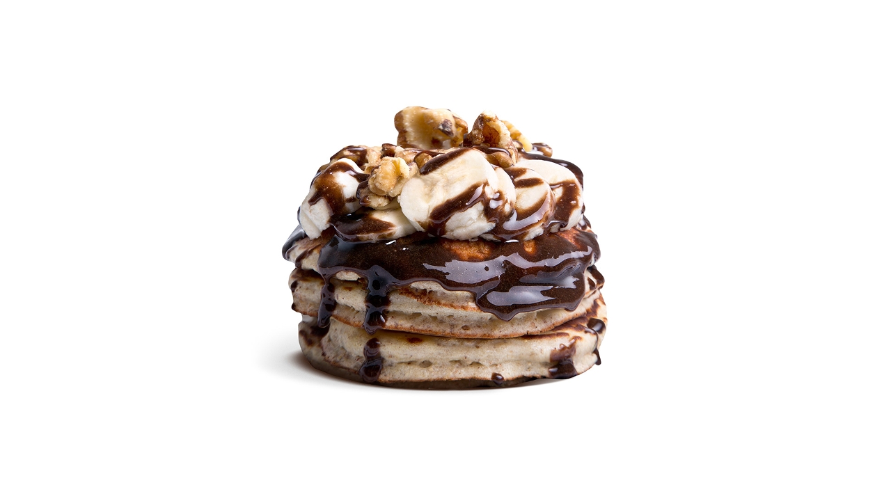 Scratch-Made Protein Pancakes infused with Dark Chocolate Chips. Topped with Banana, Walnuts, Sugar-Free Chocolate Protein Sauce. (758 cal / 46 protein, 82 carbs, 29 fat) [Contains Nuts]