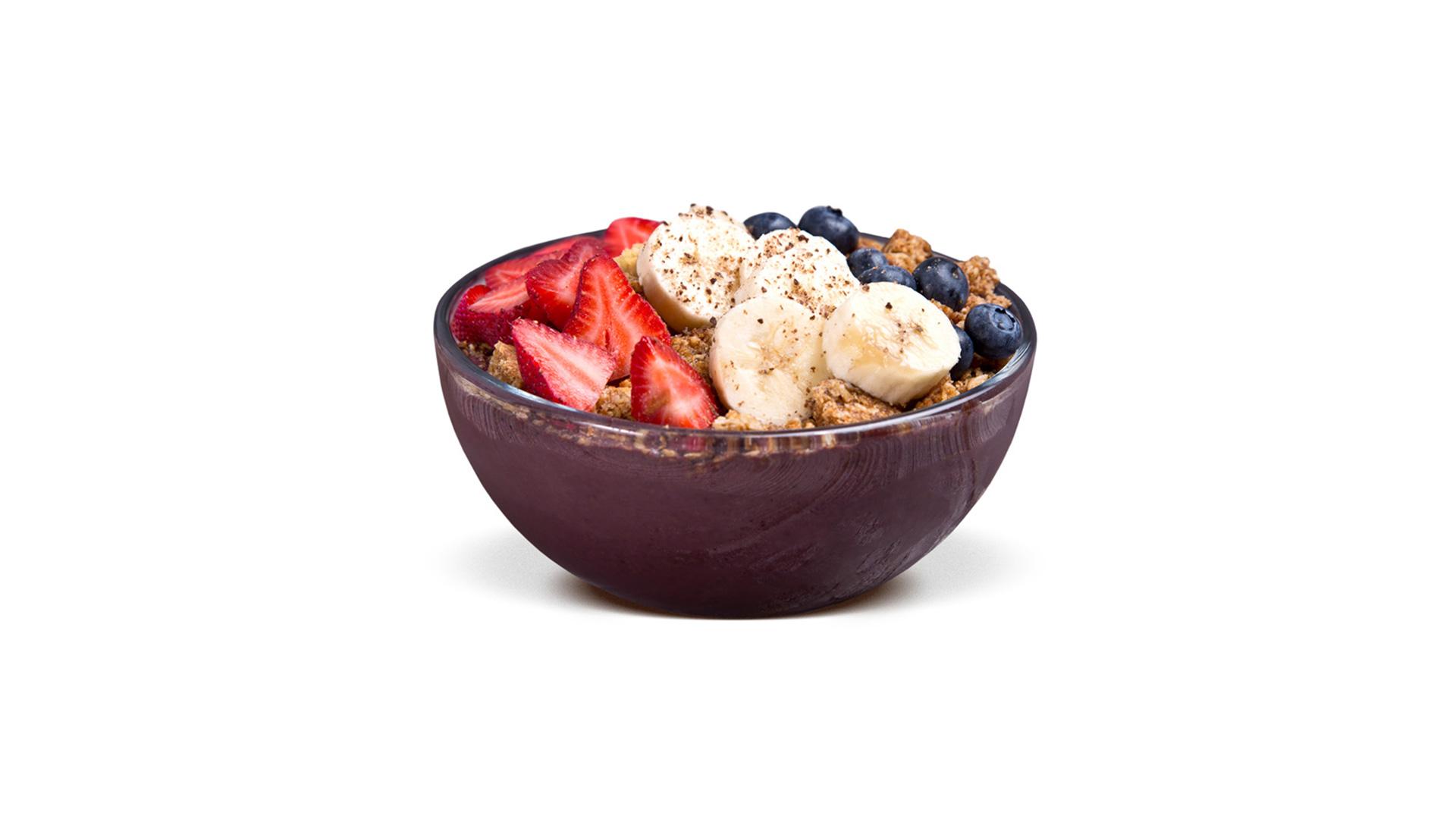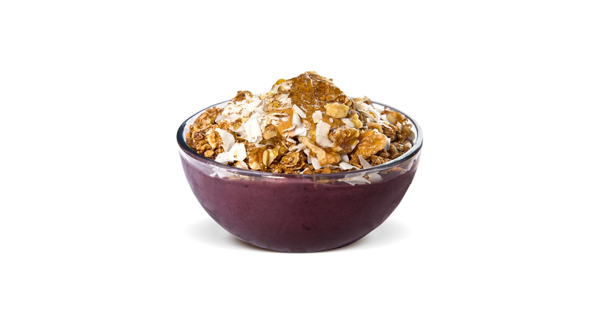 Base: Organic Unsweetened Açaí, Chocolate Whey, Banana, Blueberries, Cacao, Almond Milk. On Top: Purely Elizabeth Organic Gluten-Free Granola, Unsweetened Coconut Flakes, Walnuts, Peanut Butter, Organic Honey, Flax Seeds. (1230 cal / 46 protein, 101 carbs, 78 fat) [Contains Nuts]