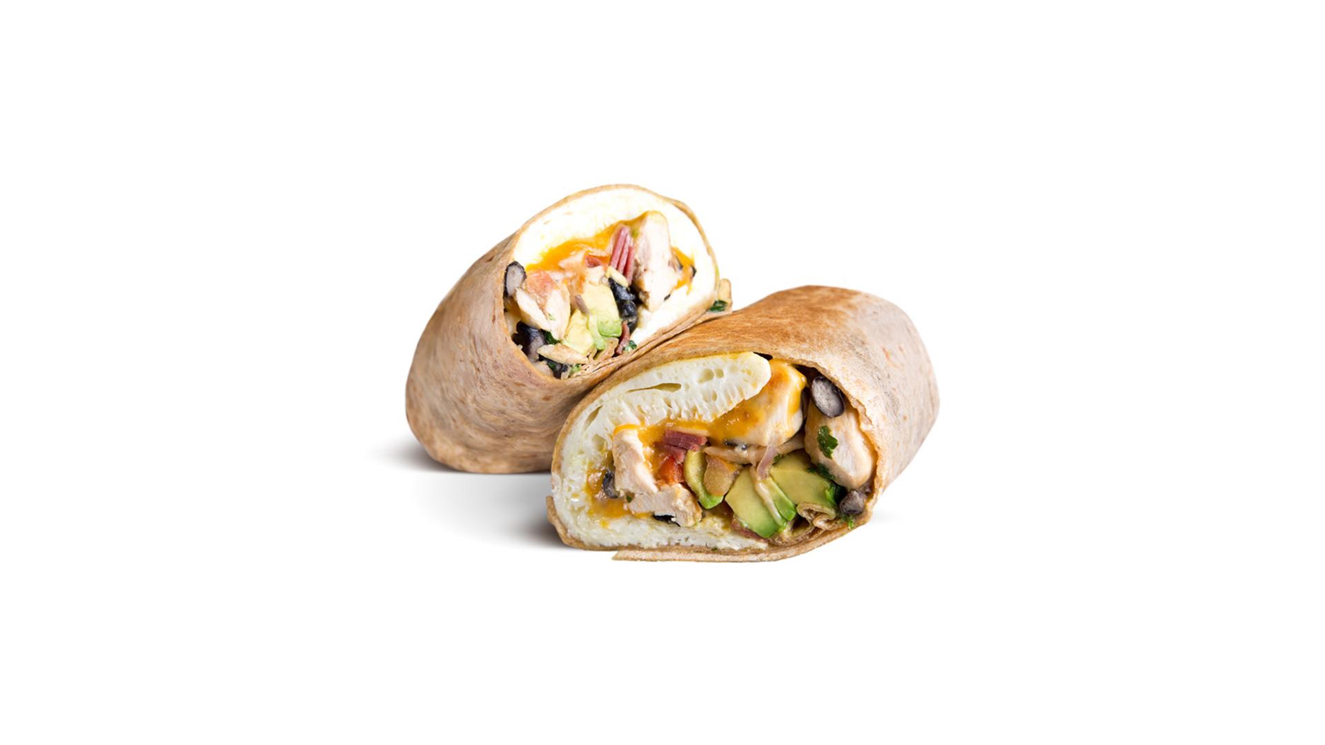 Grilled Chicken (ABF), Turkey Bacon Bits, 4 Egg Whites*, Cheddar, Avocado, Black Bean Salsa (Black Beans, Tomatoes, Cilantro, Red Peppers, Onions). Served with Side of Fruit. (957 cal / 80 protein, 71 carbs, 38 fat)